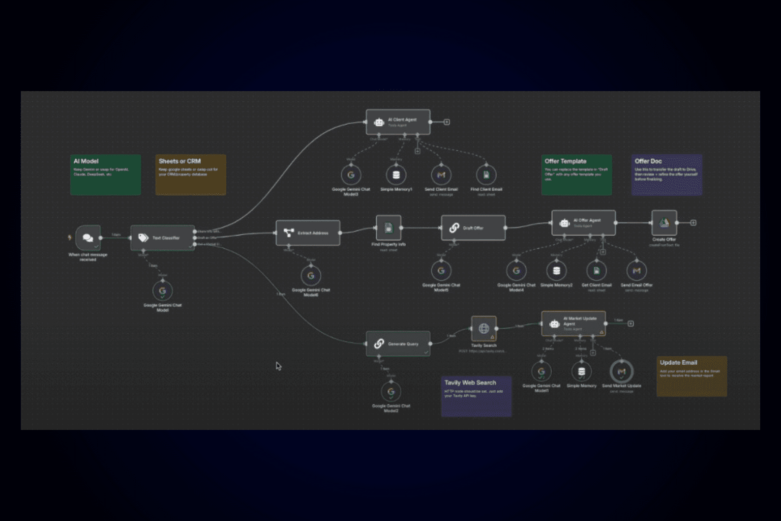 AgenSync deployed a custom automation suite powered by n8n and AI integrations. WhatsApp and email chatbots now instantly respond to inquiries, qualify leads, and schedule showings. Property data syncs automatically across CRMs, while custom alerts keep agents informed in real time. The result? Faster lead conversion, fewer missed opportunities, and a smoother customer journey—freeing up agents to focus on selling, not spreadsheets.